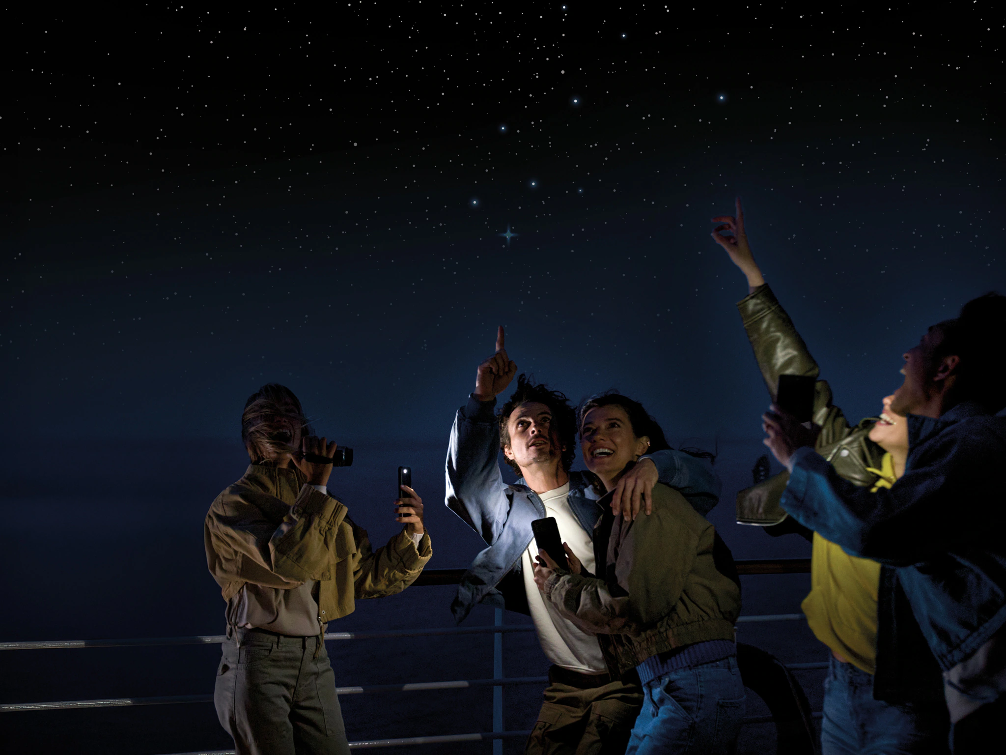 La traversée devient une expérience à part entière grâce aux Sea Destinations, ces lieux uniques en mer, sublimés par des expériences immersives imaginées par le directeur artistique italien Luca Tommassini. Sous sa direction artistique, chaque moment de navigation se transforme en une parenthèse sensorielle, où scénographie, récit et atmosphère viennent sublimer le lieu traversé par le navire. Parmi les temps forts figurent notamment le point le plus sombre de la mer des Canaries, offrant aux passagers une véritable immersion sous un ciel constellé d’étoiles, ainsi que la Crête d’Atlantis, où le navire s’approche d’une montagne sous-marine mythique, évoquant l’Atlantide à travers un univers sonore et visuel profondément immersif.