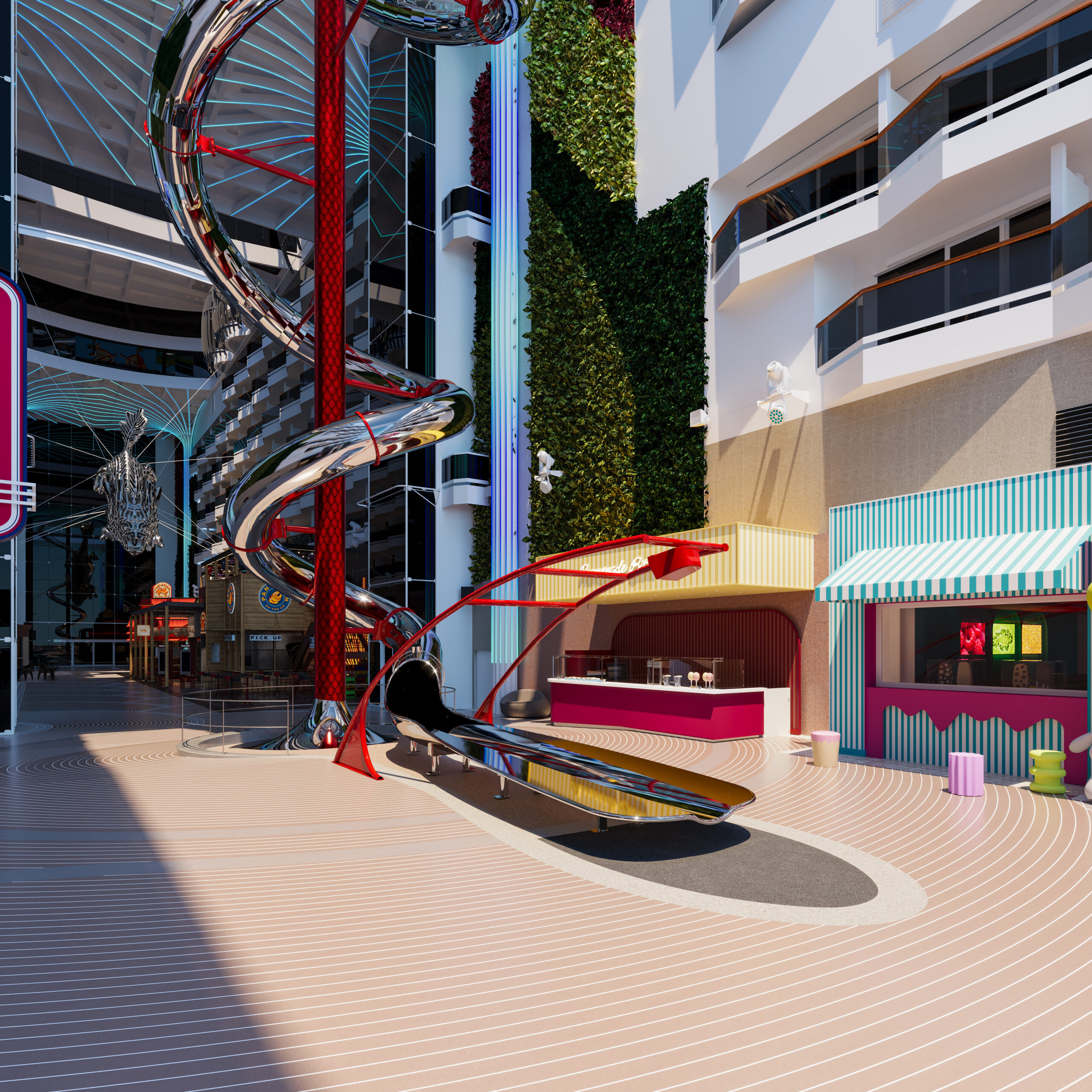 #3 – The Spiral @ Tree of Life annoncé comme le plus long toboggan sec en mer avec 81,3 mètres de glisse sur une hauteur de 12 ponts. Cet élément architectural emblématique des navires de la classe World permettra aux hôtes de rejoindre la promenade extérieure en quelques secondes. Son nouveau design s’inspire des arbres iconiques des Gardens by the Bay de Singapour, en écho aux influences asiatiques du navire.