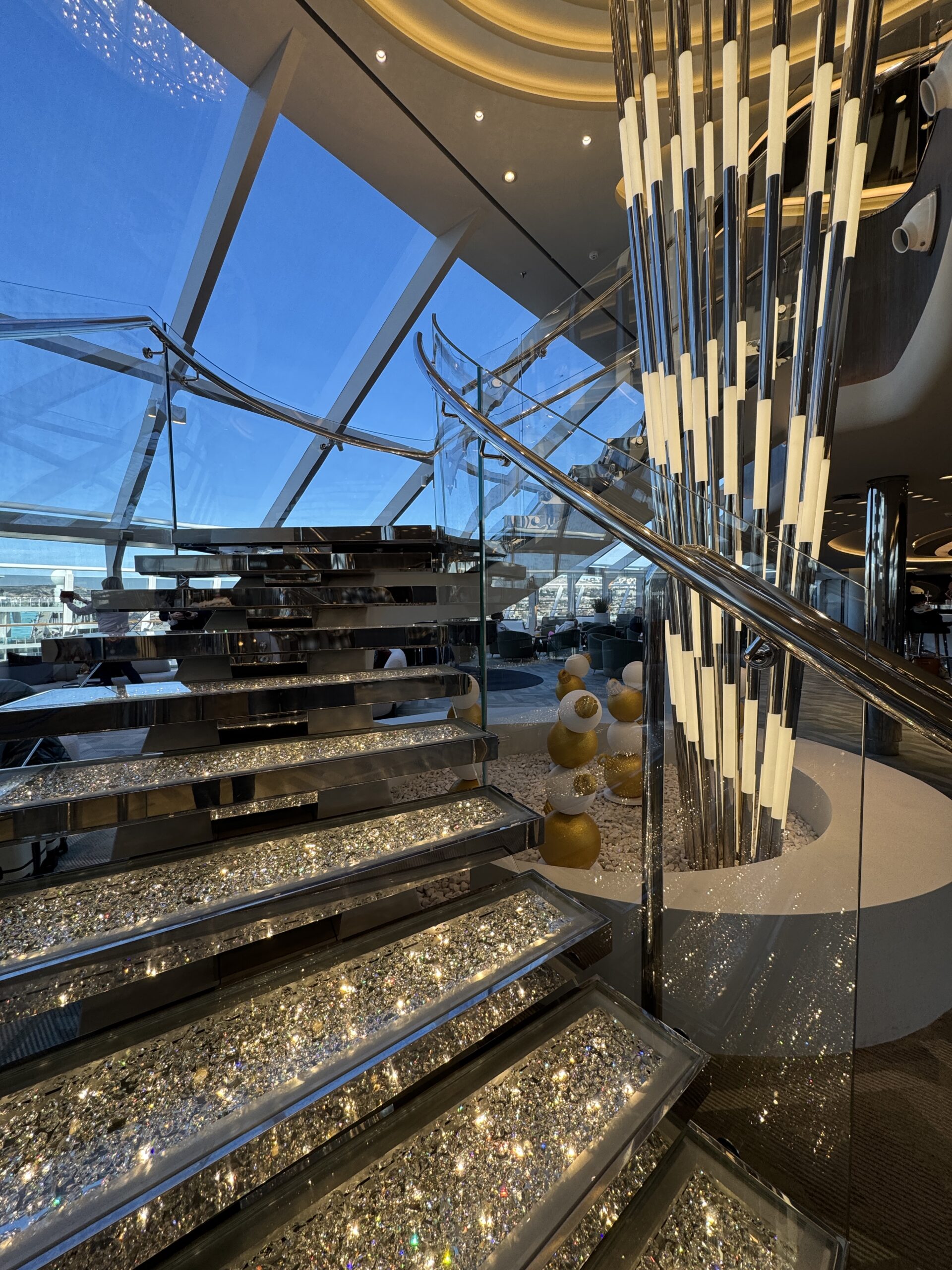 Vous pouvez accéder à ce restaurant, depuis le Top Sail Lounge, grâce à un escalier dont les marches sont incrustées de cristaux Swarovski.