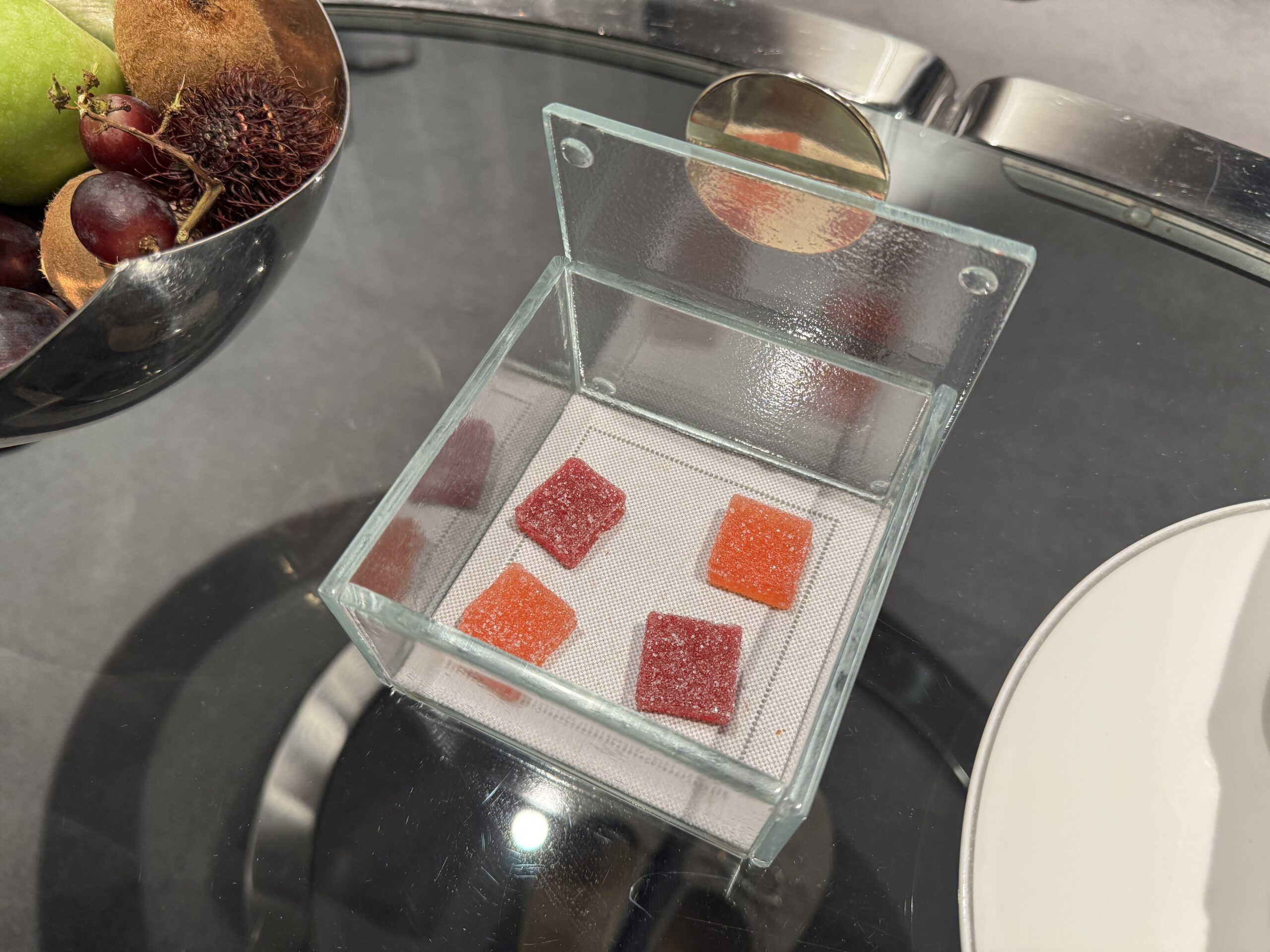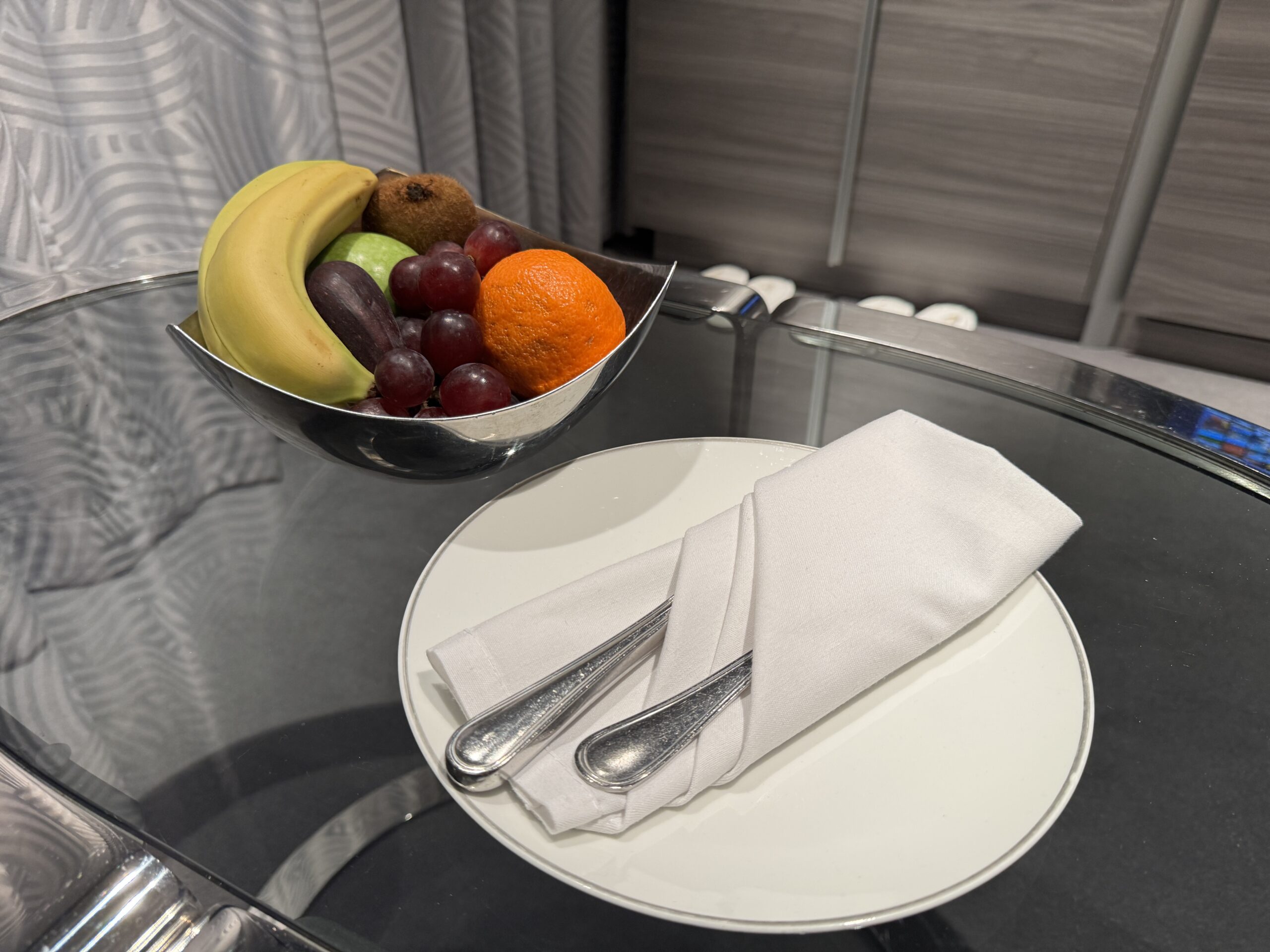 Chaque jour, le personnel de chambre a déposé dans notre cabine une petite attention. Une corbeille de fruits, une boîte de chocolats, des mignardises… Chaque soir, nous étions impatients de rentrer dans notre chambre pour voir ce qu’on avait laissé comme surprise.