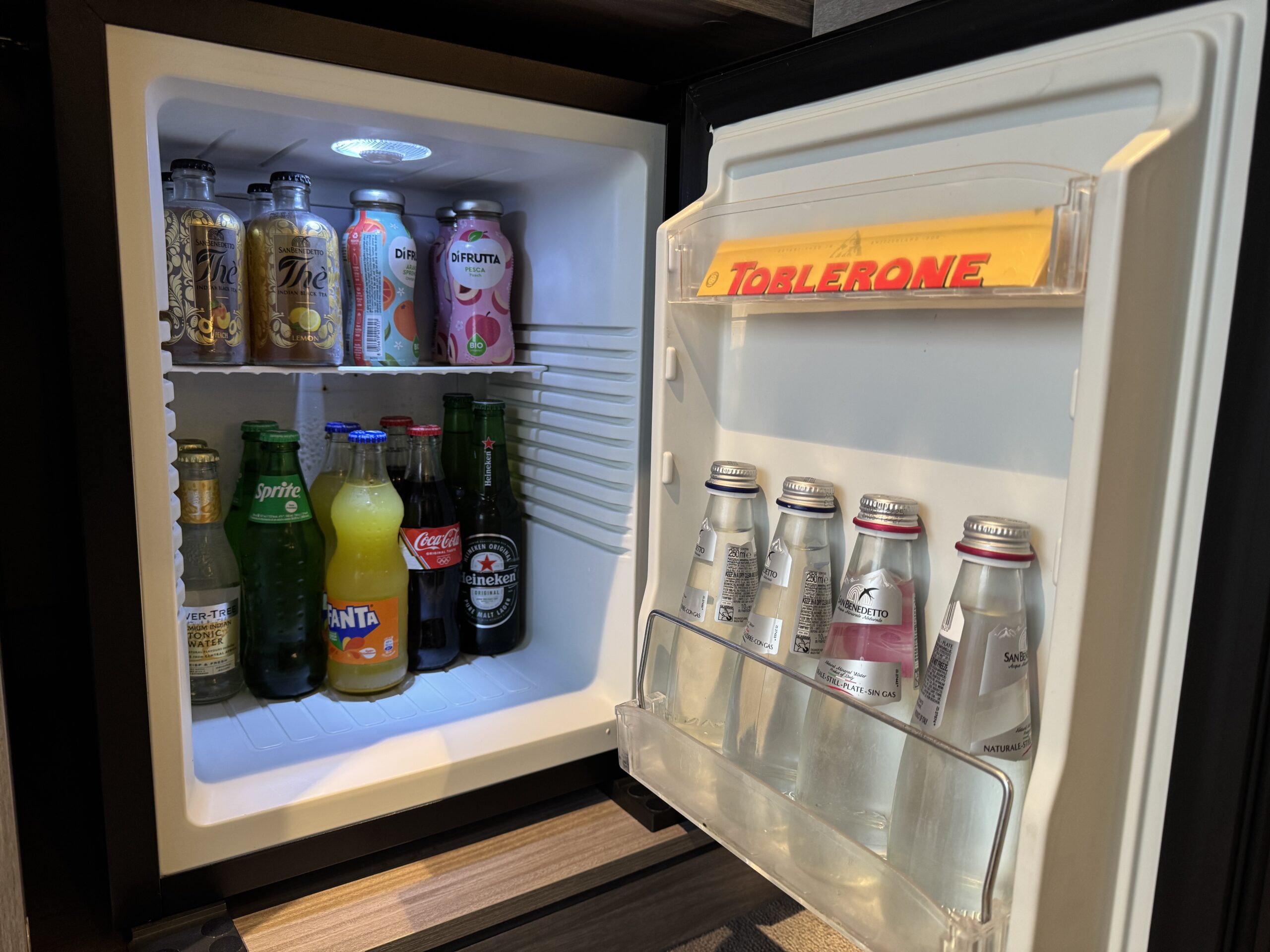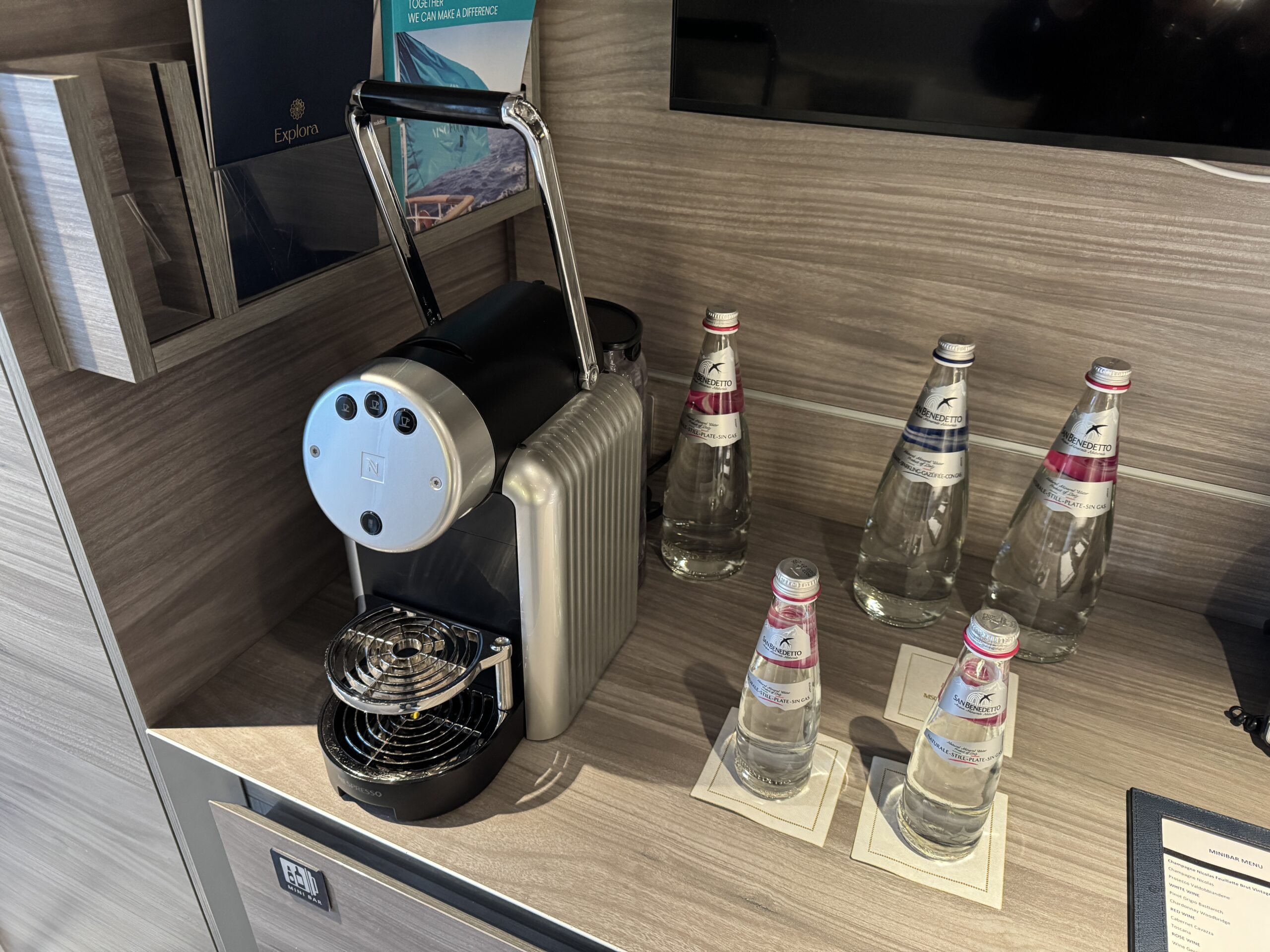 Dans votre cabine, toutes les boissons du minibar sont gratuites et plusieurs bouteilles d’eau – plates et pétillantes – sont mises à votre disposition. Vous avez aussi à votre disposition une machine à expresso et un large éventail de thés et infusions.