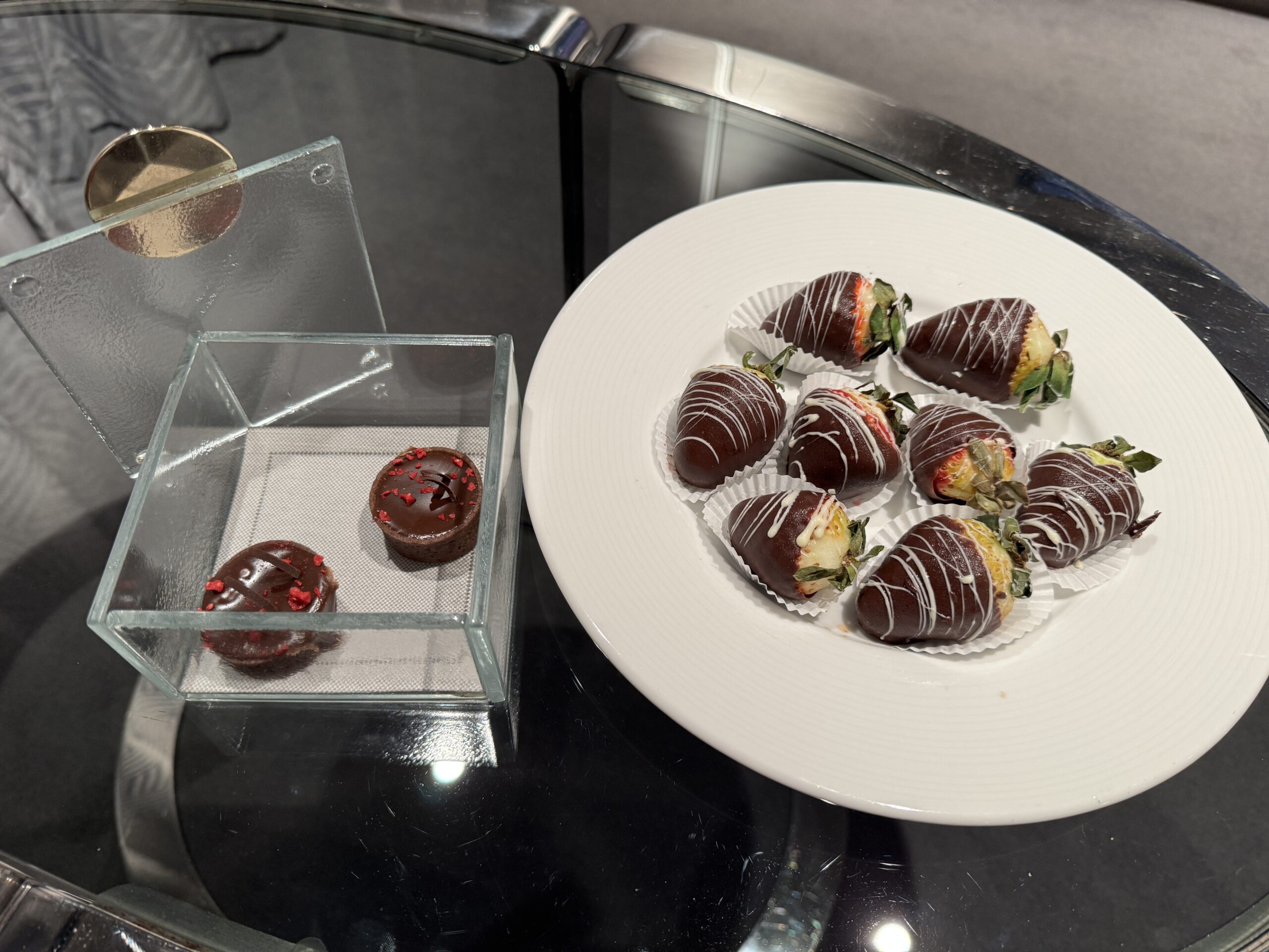 Nos valises sont prises en charge par le personnel et, pendant que nos documents de voyage sont vérifiés, nous patientons en dégustant de savoureux chocolats truffés.