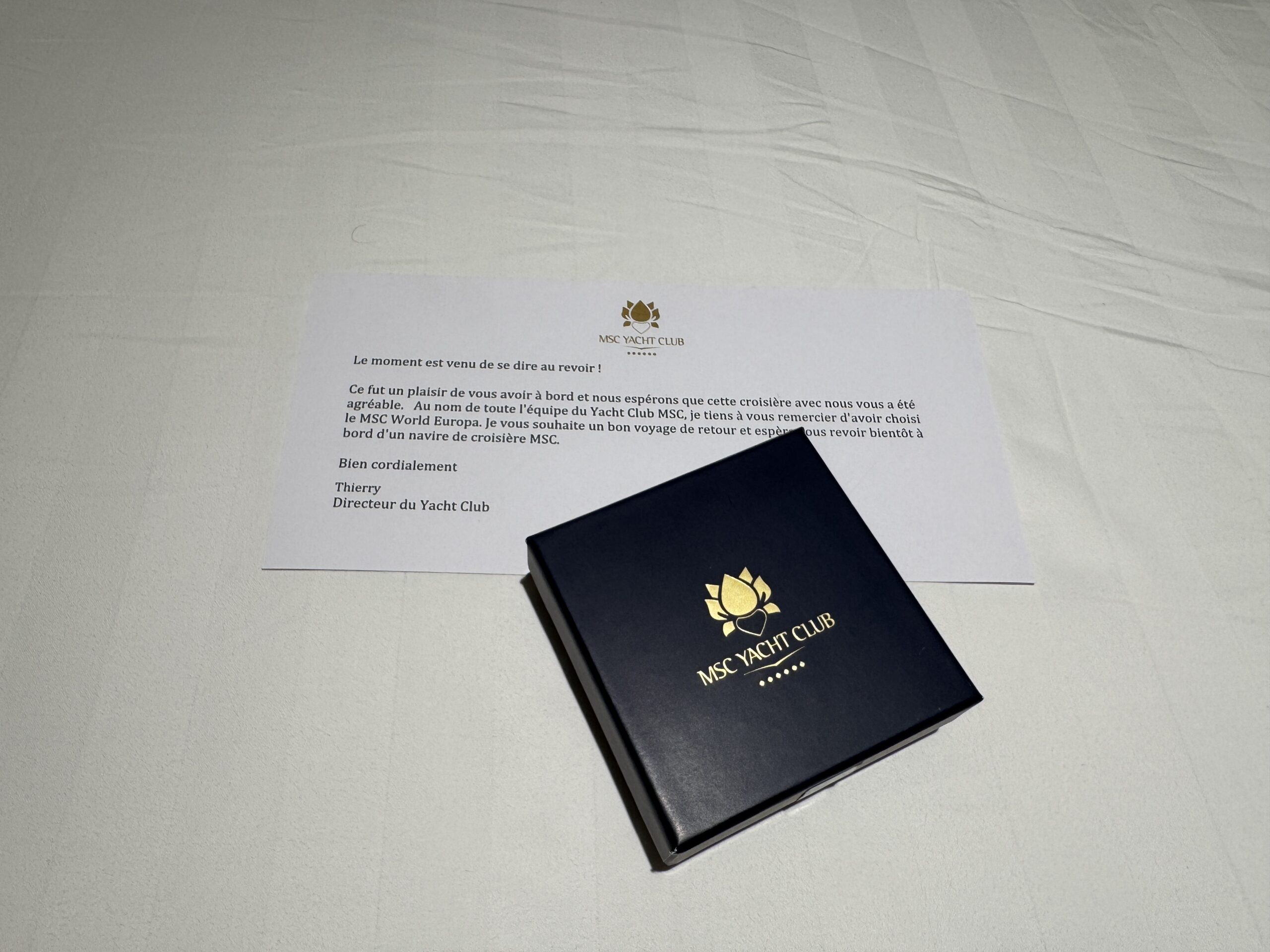 La prévenance du personnel se matérialise aussi par les petits mots laissés dans la cabine. Vers la fin du voyage, nous avons dû naviguer par gros temps. Nous avons reçu une lettre du capitaine pour nous annoncer l’arrivée du mauvais temps et s’excuser de la gêne que le tangage risque de provoquer.