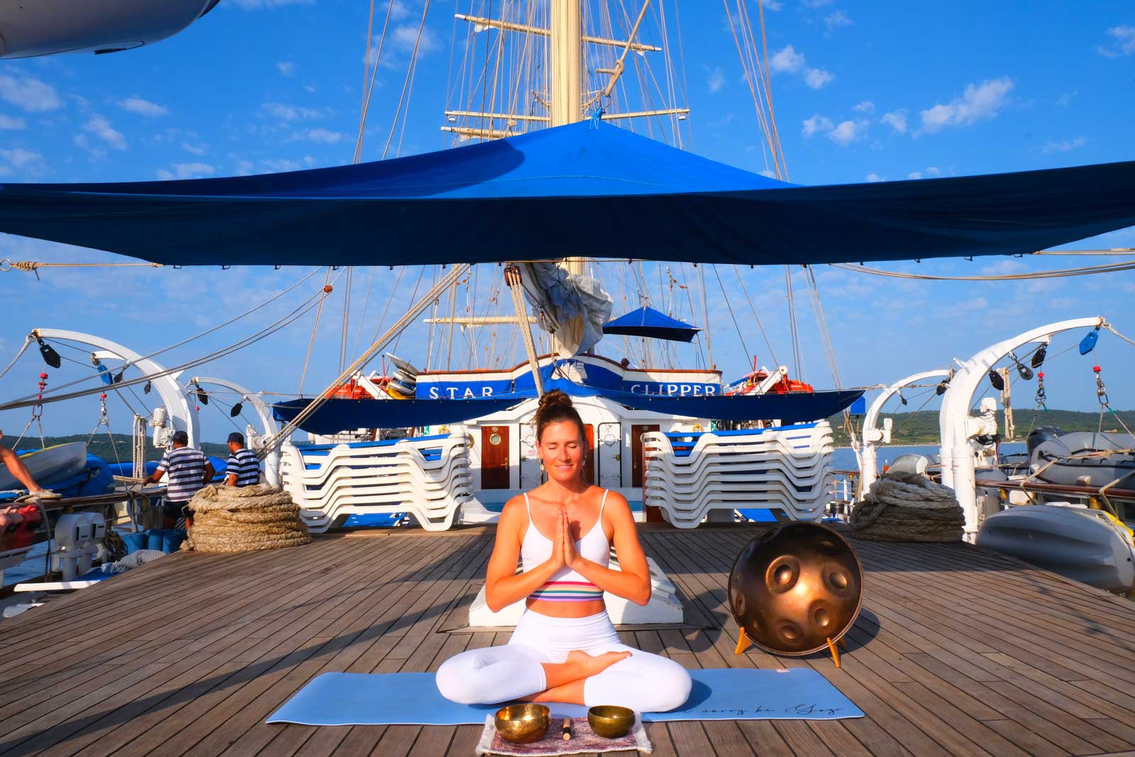 - séances de yoga matin et soir, sur le pont à l’air libre, sous les majestueuses voiles blanches ; elles sont accessibles à tous niveaux et axées sur la respiration, l’ancrage et la détente.
